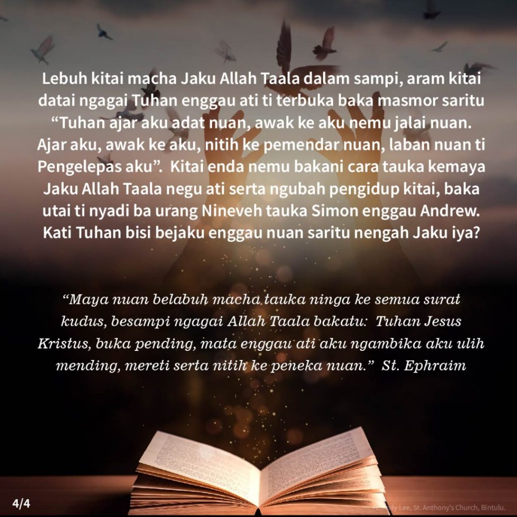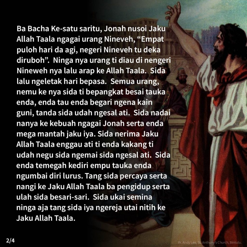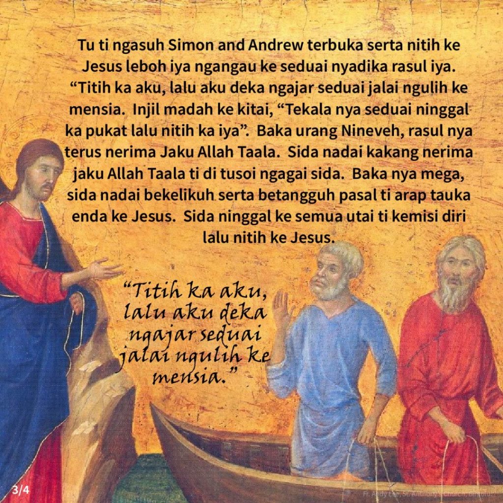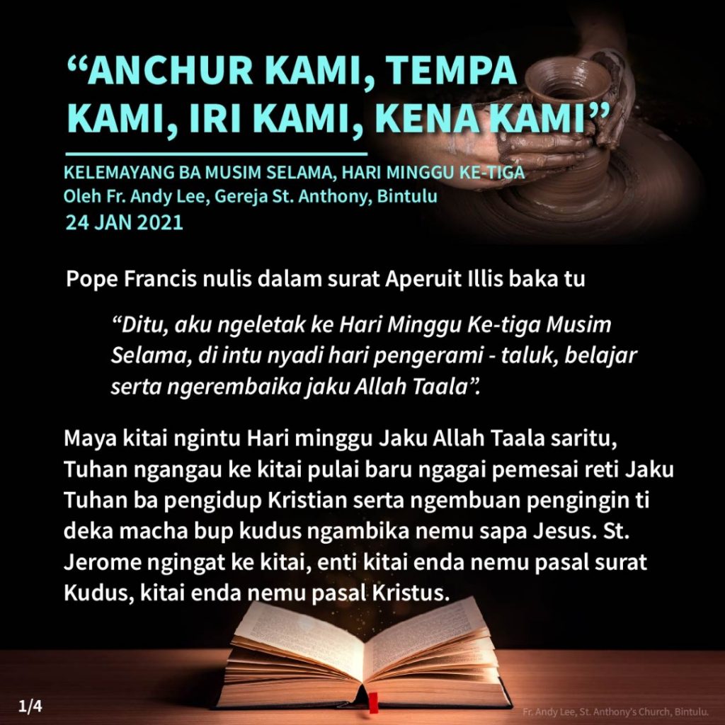 Iban, Reflections Kelemayang Ba Musin Selama, Hari Minggu Ke-3 (24hb Januari 2021) Posted on 23 January 202130 January 2021 by Fr. Andy Lee Fr. Andy Lee, Gereja St. Anthony, Bintulu Fr. Andy Lee Reflection of the 3rd Sunday in Ordinary Time (24th January 2021) 常年期第三主日的反思2 (2021年1月24日)