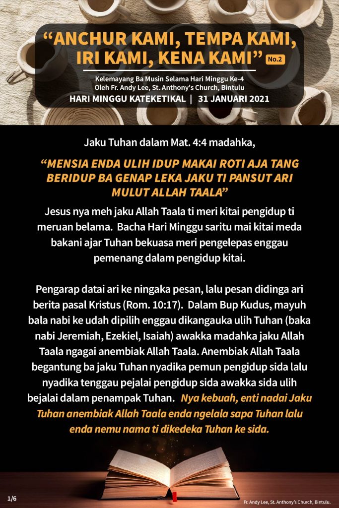 Iban, Reflections Kelemayang Ba Musin Selama Hari Minggu Ke-4 (31hb Januari 2021) Posted on 30 January 202130 January 2021 by Fr. Andy Lee Fr. Andy Lee 常年期第三主日(2021年1月24日) Renungan Hari Minggu Biasa ke-4 (31hb Januari 2021)