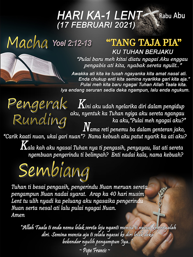 40 Days of Lent, 40 HARI LENT, Iban HARI KA-1 LENT (17 Februari 2021) Posted on 19 February 202123 March 2021 by Fr. Andy Lee Fr. Andy Lee PRAPASKA HARI KE-2 (18 Februari 2021) HARI KA-2 LENT (18 Februari 2021)