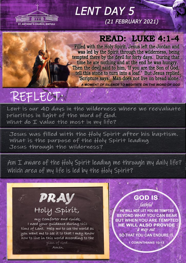 40 Days of Lent, English LENT DAY 5 (21 FEBRUARY 2021) Posted on 21 February 2021 by Fr. Andy Lee Fr. Andy Lee HARI KE-4 PRAPASKA (20 FEBRUARI 2021) HARI KE-5 PRAPASKA (21 FEBRUARI 2021)