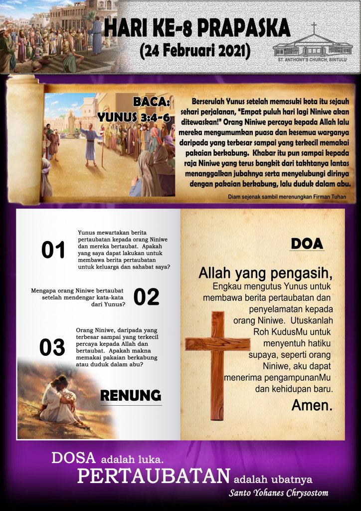 40 Days of Lent, Bahasa Malaysia HARI KE-8 PRAPASKA (24 FEBRUARI 2021) Posted on 24 February 2021 by Fr. Andy Lee Fr. Andy Lee HARI KE-7 PRAPASKA (23 FEBRUARI 2021) HARI KA-7 LENT (23 FEB 2021)