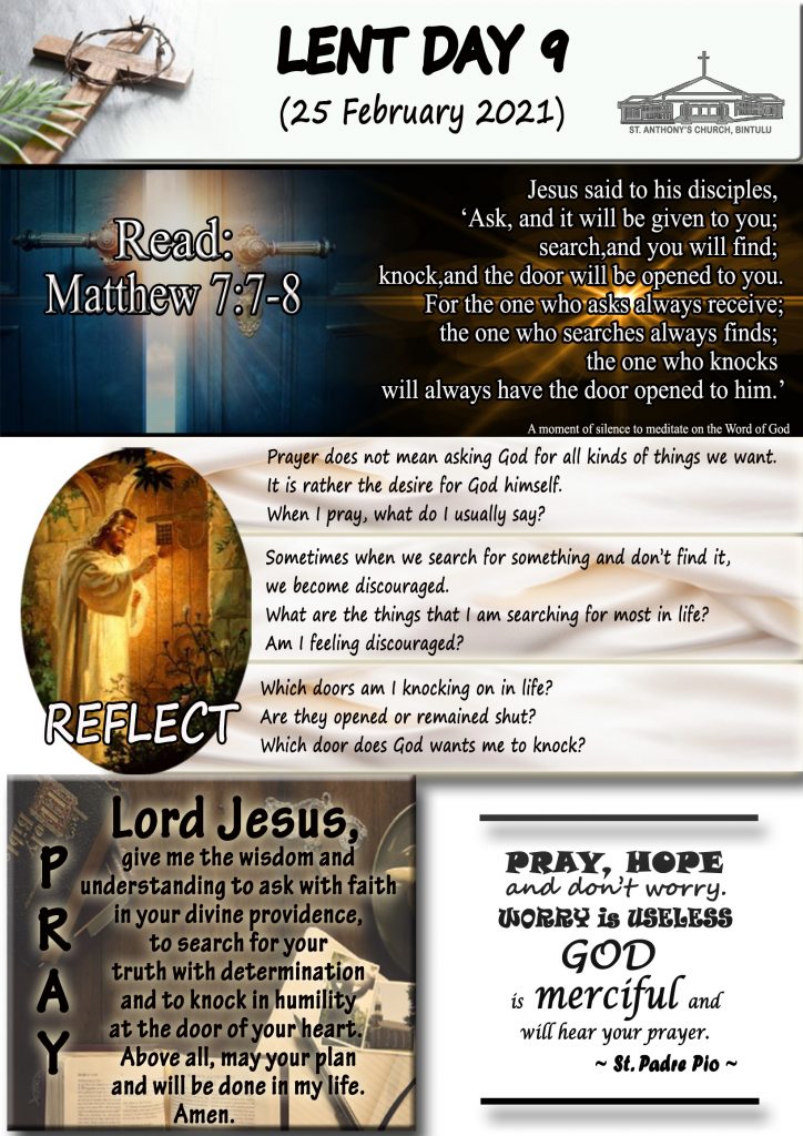 40 Days of Lent, English LENT DAY 9 (25 FEBRUARY 2021) Posted on 24 February 2021 by Fr. Andy Lee Fr. Andy Lee HARI KA-8 LENT (24 FEB 2021) HARI KE-9 PRAPASKA (25 FEBRUARI 2021)