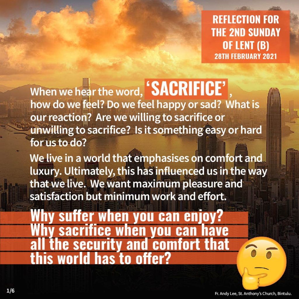 English, Reflections Reflection for The 2nd Sunday of Lent (28th February 2021) Posted on 25 February 2021 by Fr. Andy Lee Fr. Andy Lee LENT DAY 10 (26 FEBRUARY 2021) 四旬期第二主日(已年)反思 (2021年2月28日)