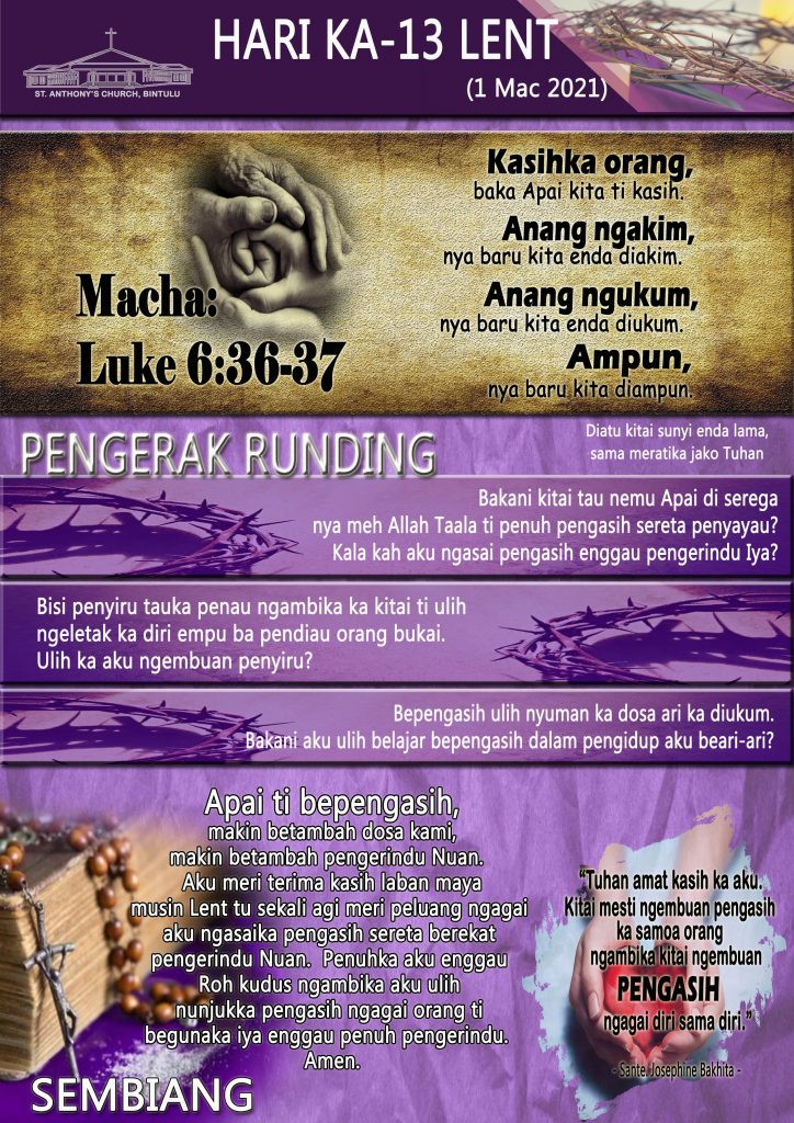 40 Days of Lent, Iban HARI KA-13 LENT (1 MAC 2021) Posted on 1 March 2021 by Fr. Andy Lee Fr. Andy Lee HARI KE-13 PRAPASKA (1 MAC 2021) LENT DAY 14 (2 MARCH 2021)