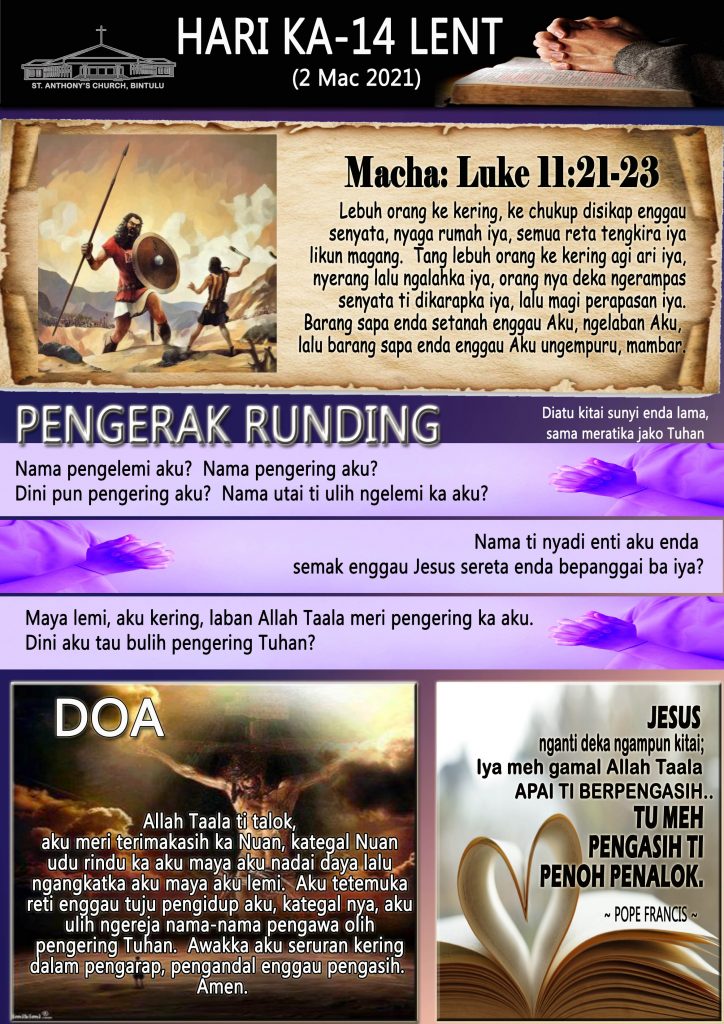 40 Days of Lent, Iban HARI KA-14 LENT (2 MAC 2021) Posted on 2 March 20211 March 2021 by Fr. Andy Lee Fr. Andy Lee HARI KE-14 PRAPASKA (2 MAC 2021) LENT DAY 15 (3 MARCH 2021)