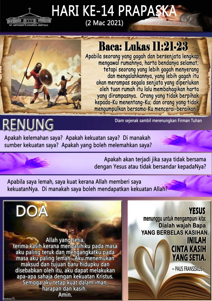 40 Days of Lent, Bahasa Malaysia HARI KE-14 PRAPASKA (2 MAC 2021) Posted on 2 March 20211 March 2021 by Fr. Andy Lee Fr. Andy Lee LENT DAY 14 (2 MARCH 2021) HARI KA-14 LENT (2 MAC 2021)