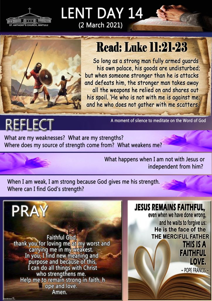 40 Days of Lent, English LENT DAY 14 (2 MARCH 2021) Posted on 2 March 20211 March 2021 by Fr. Andy Lee Fr. Andy Lee HARI KA-13 LENT (1 MAC 2021) HARI KE-14 PRAPASKA (2 MAC 2021)