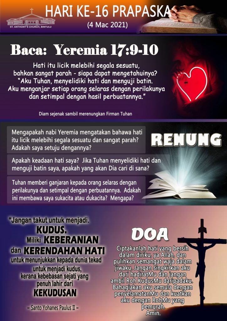 40 Days of Lent, Bahasa Malaysia HARI KE-16 PRAPASKA (4 MAC 2021) Posted on 4 March 2021 by Fr. Andy Lee Fr. Andy Lee HARI KA-16 LENT (4 MAC 2021) LENT DAY 17 (5 MARCH 2021)