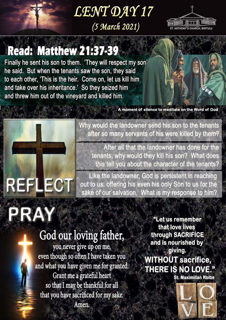 40 Days of Lent, English LENT DAY 17 (5 MARCH 2021) Posted on 5 March 20214 March 2021 by Fr. Andy Lee Fr. Andy Lee HARI KE-16 PRAPASKA (4 MAC 2021) HARI KE-17 PRAPASKA (5 MAC 2021)