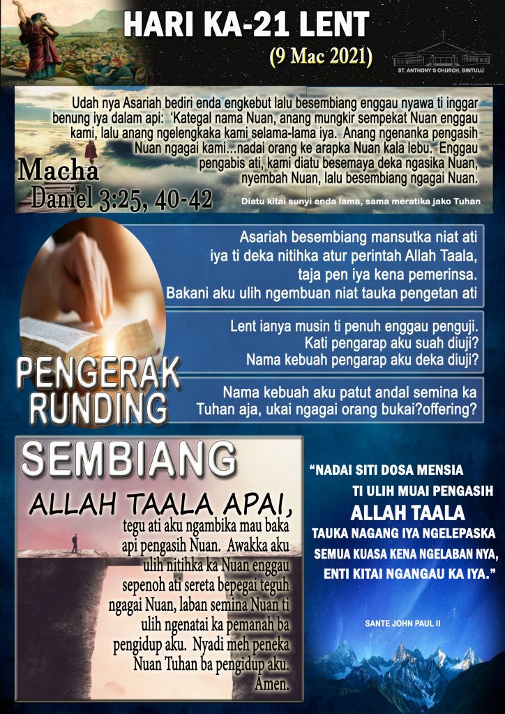 40 Days of Lent, Iban HARI KA-21 LENT (9 MAC 2021) Posted on 9 March 2021 by Fr. Andy Lee Fr. Andy Lee HARI KE-21 PRAPASKA (9 MAC 2021) LENT DAY 22 (10th MARCH 2021)