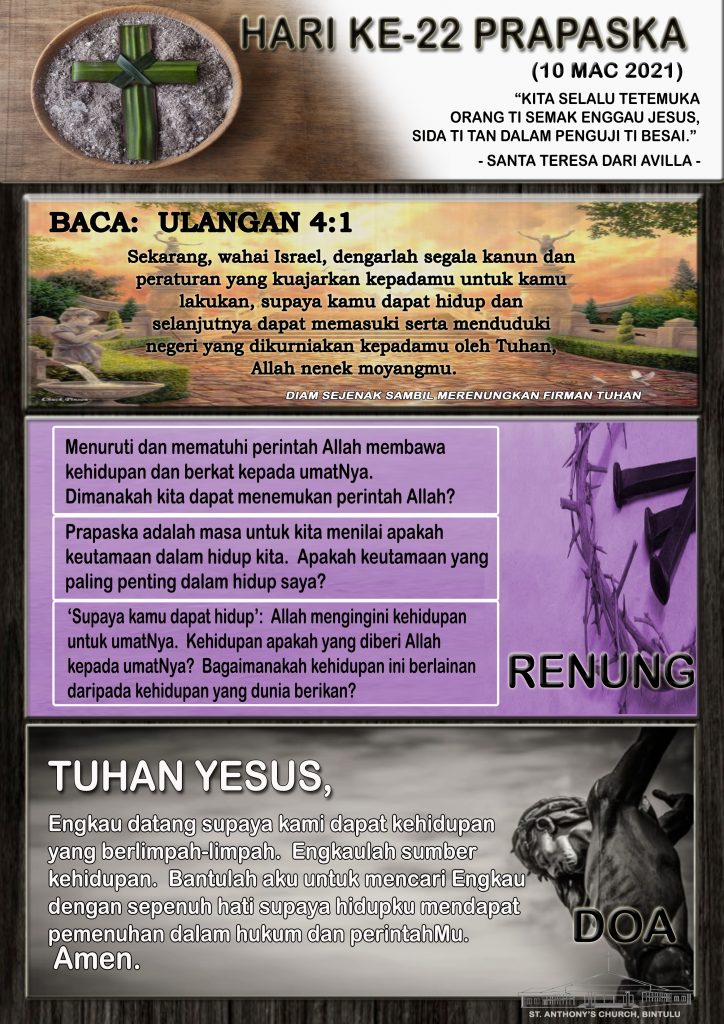 40 Days of Lent, Bahasa Malaysia HARI KE-22 PRAPASKA (10 MAC 2021) Posted on 10 March 20219 March 2021 by Fr. Andy Lee Fr. Andy Lee LENT DAY 22 (10th MARCH 2021) HARI KA-22 LENT (10 MAC 2021)
