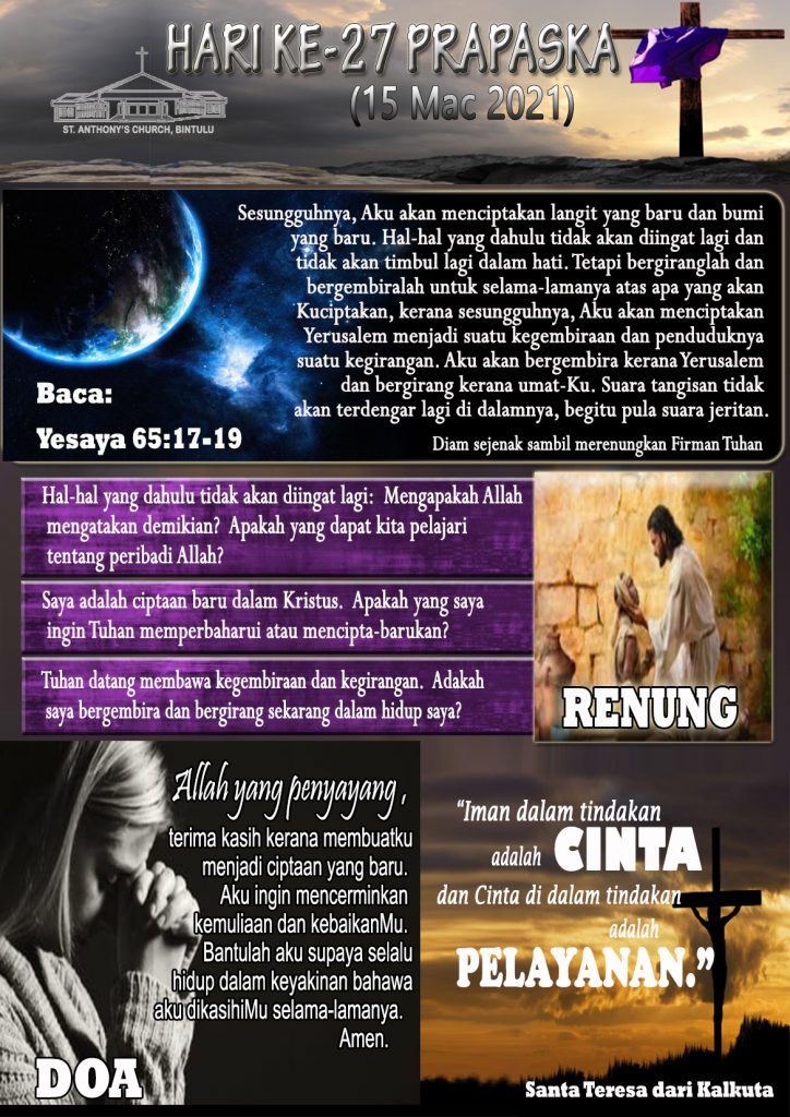 40 Days of Lent, Bahasa Malaysia HARI KE-27 PRAPASKA (15 MAC 2021) Posted on 15 March 202114 March 2021 by Fr. Andy Lee Fr. Andy Lee LENT DAY 27 (15th MARCH 2021) HARI KA-27 LENT (15 MAC 2021)