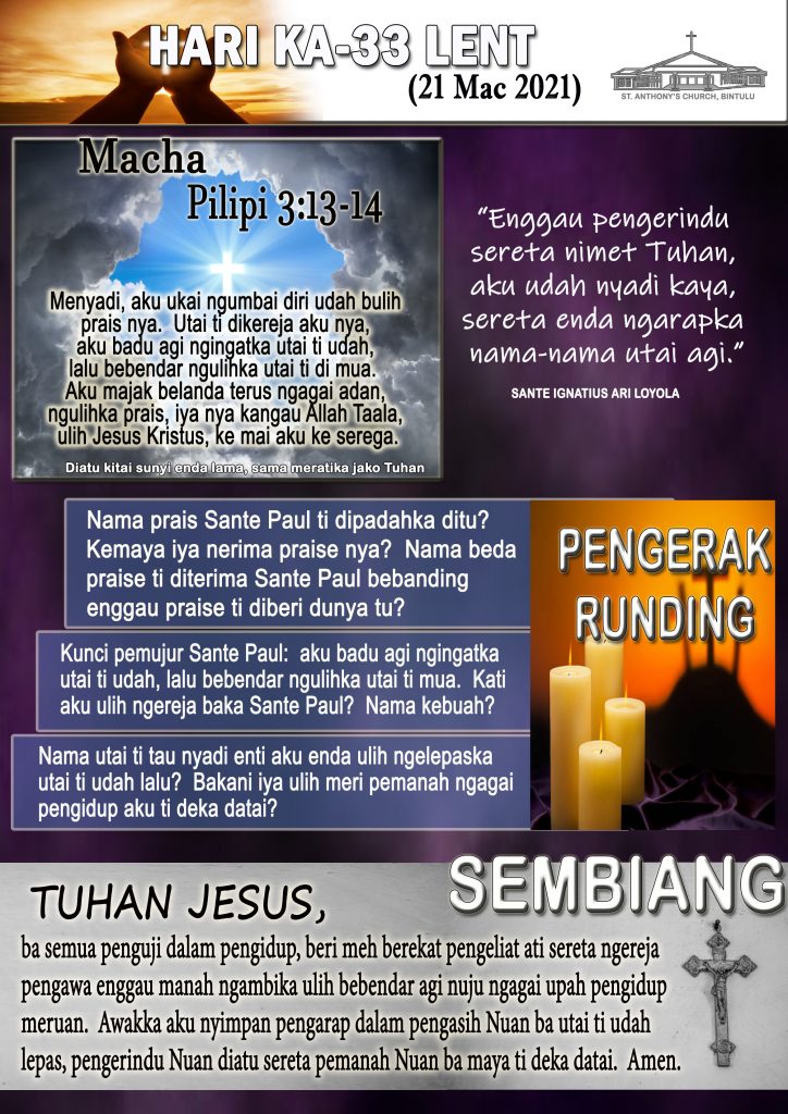 40 Days of Lent, Iban HARI KA-33 LENT (21 MAC 2021) Posted on 20 March 2021 by Fr. Andy Lee Fr. Andy Lee HARI KE-33 PRAPASKA (21 MAC 2021) LENT DAY 34 (22nd MARCH 2021)