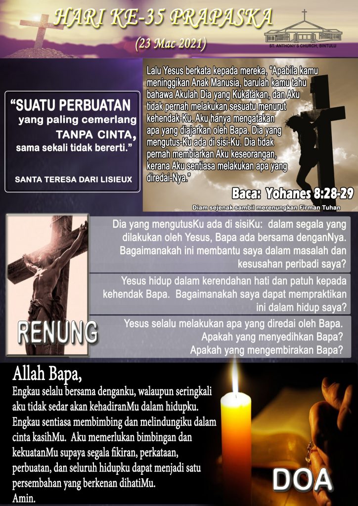 40 Days of Lent, Bahasa Malaysia HARI KE-35 PRAPASKA (23 MAC 2021) Posted on 23 March 202122 March 2021 by Fr. Andy Lee Fr. Andy Lee LENT DAY 35 (23rd MARCH 2021) HARI KA-35 LENT (23 MAC 2021)