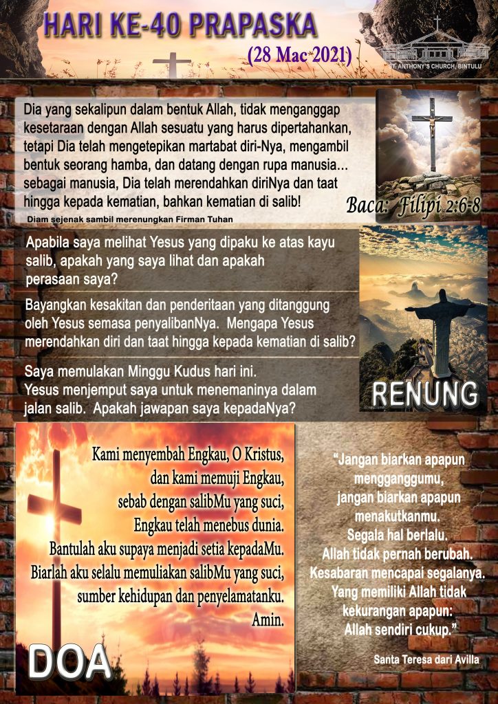 40 Days of Lent, Bahasa Malaysia HARI KE-40 PRAPASKA (28 MAC 2021) Posted on 27 March 2021 by Fr. Andy Lee Fr. Andy Lee LENT DAY 40 (28th MARCH 2021) Church Notices for Palm Sunday (28th March 2021)