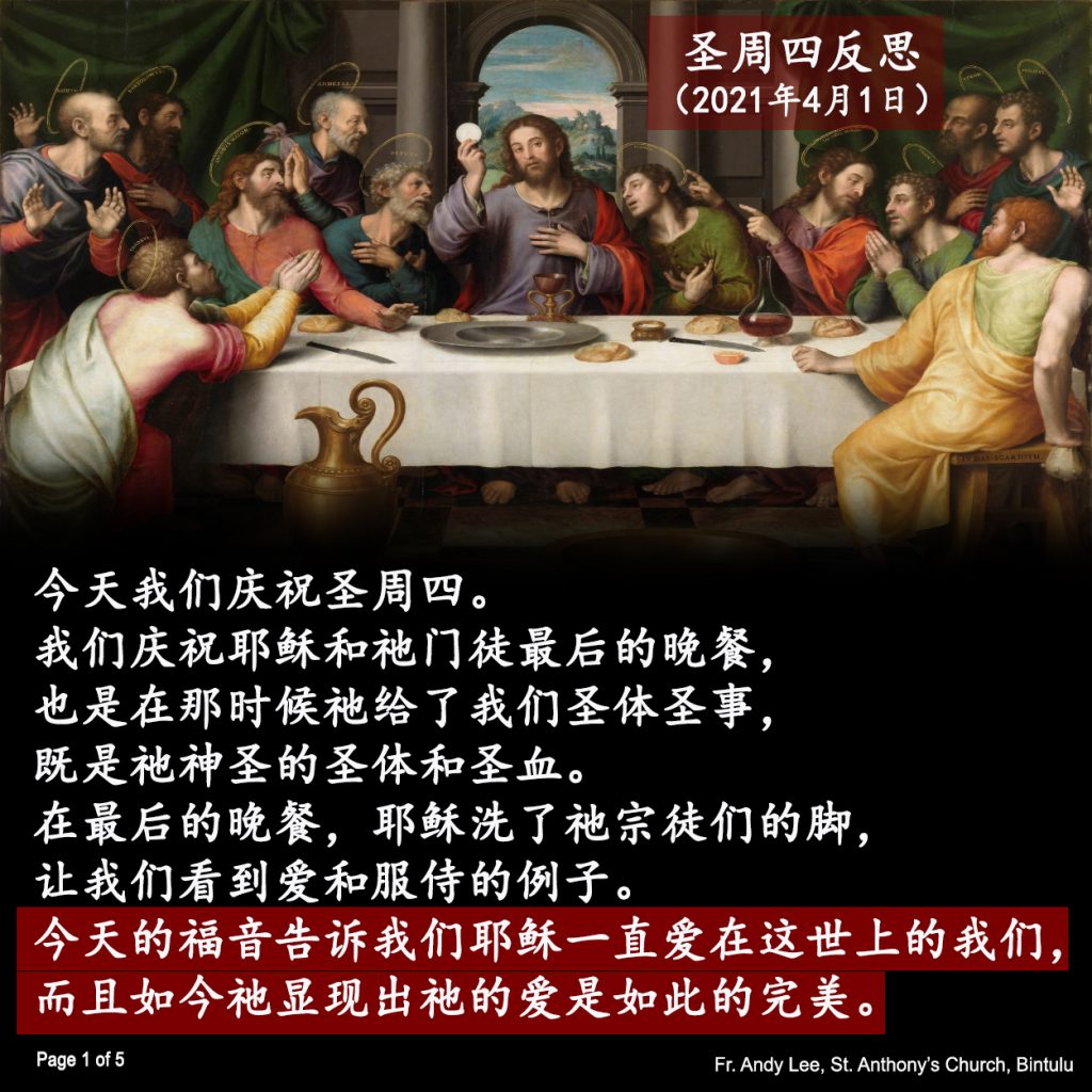 Chinese, Reflections 圣周四(已年)反思 (2021年4月1日) Posted on 1 April 2021 by Fr. Andy Lee Fr. Andy Lee Renungan Hari Minggu Palma (28hb MAC 2021) Refleksyen Hari Empat Kudus Tahun B (1hb April 2021)