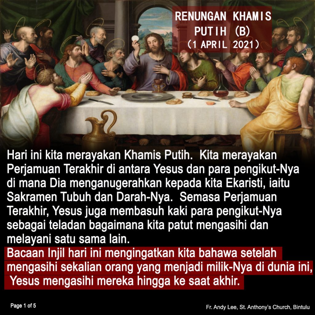 Bahasa Malaysia, Reflections Renungan Khamis Putih (1hb APRIL 2021) Posted on 1 April 2021 by Fr. Andy Lee Fr. Andy Lee Refleksyen Hari Empat Kudus Tahun B (1hb April 2021) Reflection for Holy Thursday (1st April 2021)