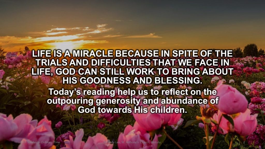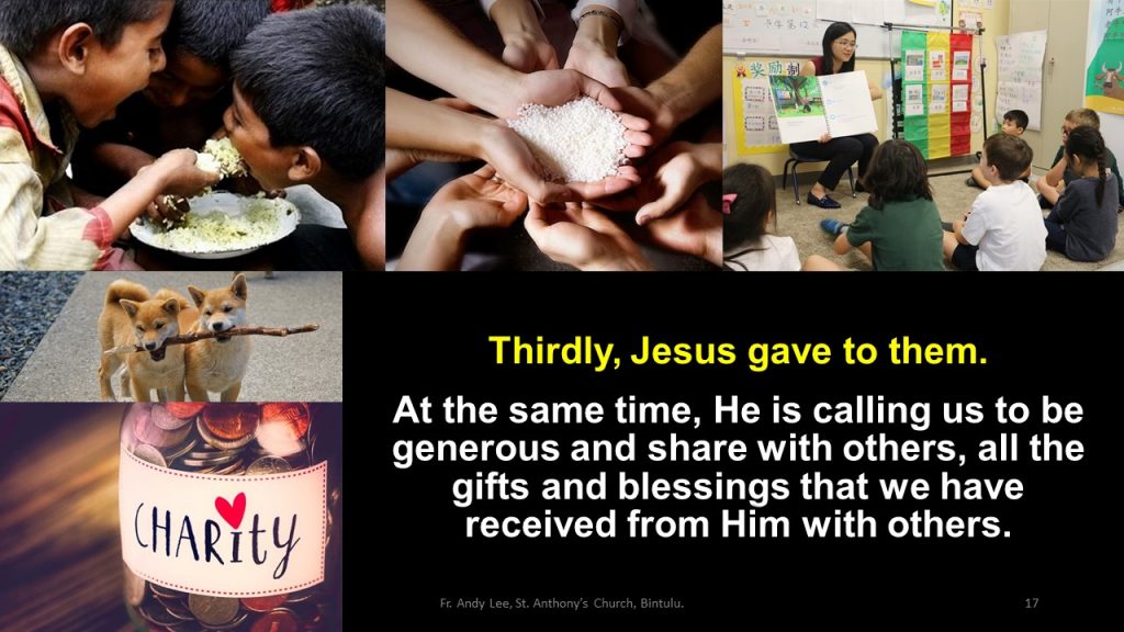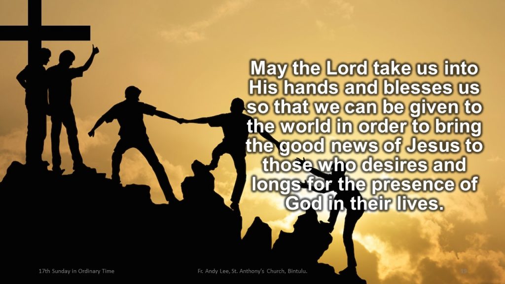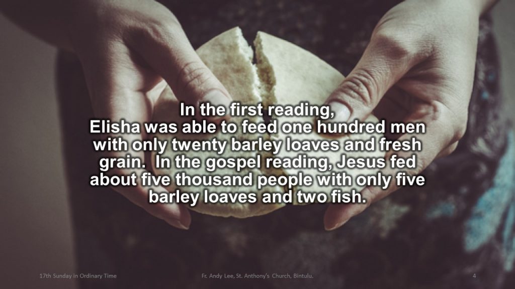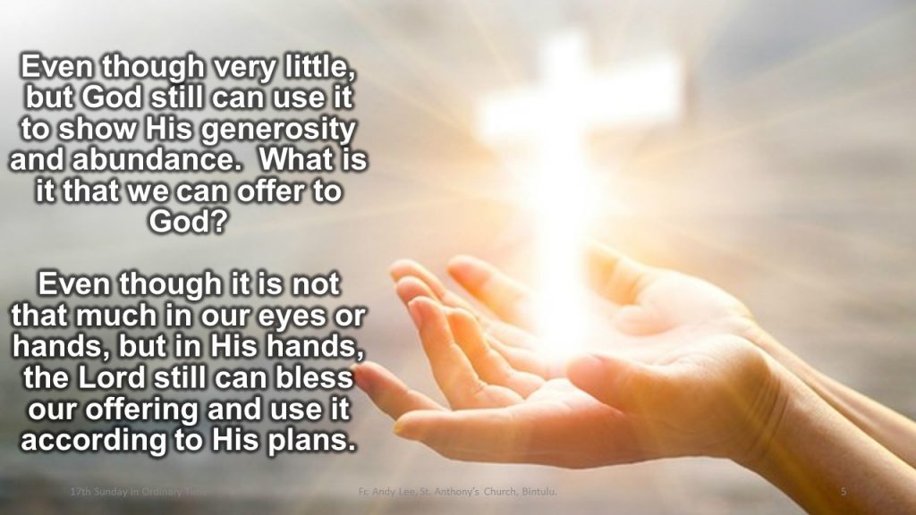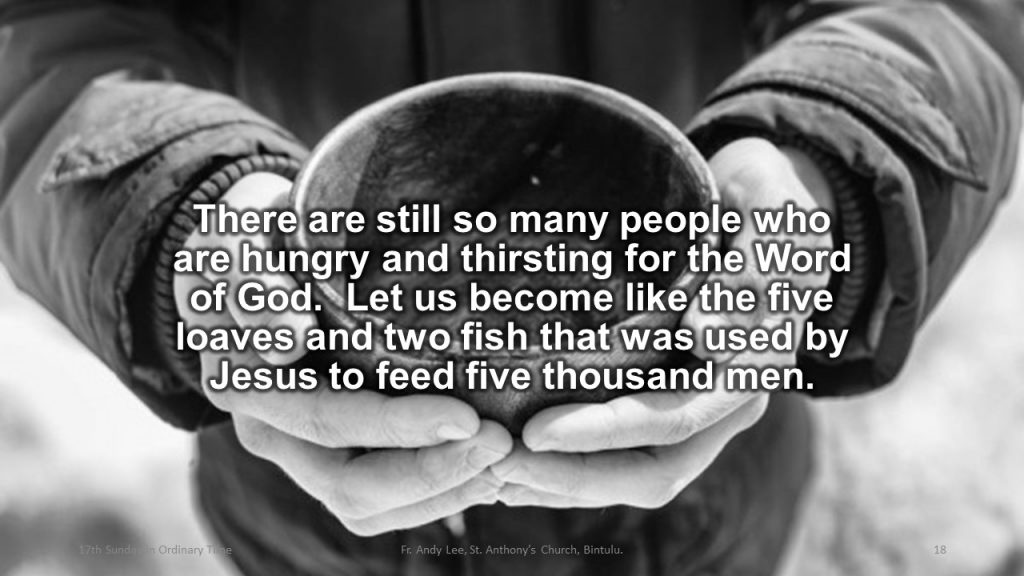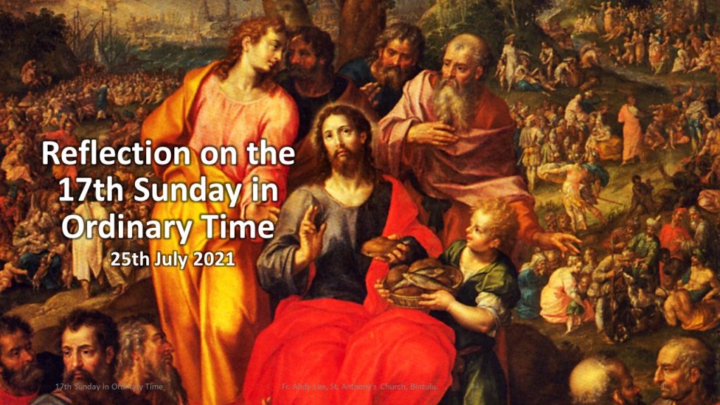 English, Reflections Reflection on 17th Sunday in Ordinary Time (24th July 2021) Posted on 28 July 2021 by Fr. Andy Lee Fr. Andy Lee 17th SUNDAY IN ORDINARY TIME (B) CHURCH NOTICE (25th July 2021) Refleksyen Hari Minggu Selama Ke-17 Tahun B (25hb Julai 2021)